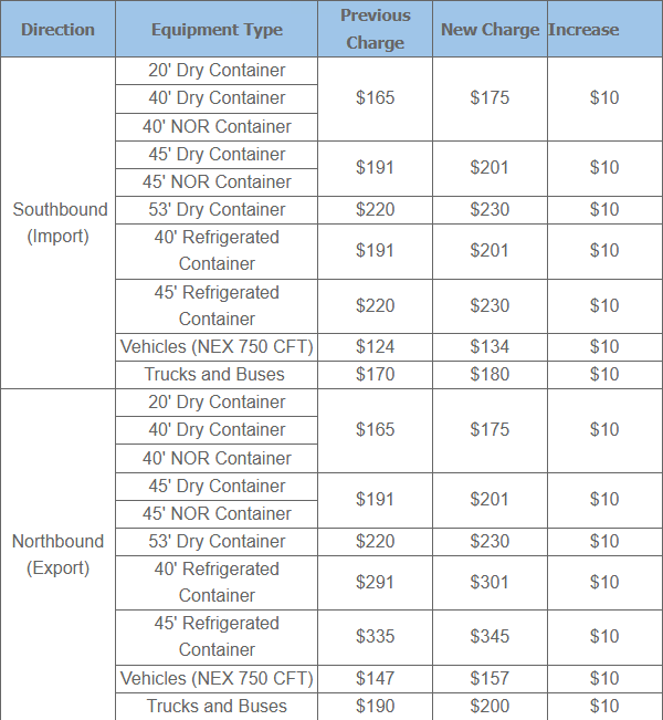 Following increases from the Honduras Terminal Operator, OPC, we wish to advise the trade of an increase to the Honduras Terminal Charge (HTC) effective January 04, 2026. The following increases will be applicable on all import (southbound) or export (northbound) cargo via Puerto Cortes, Honduras.
